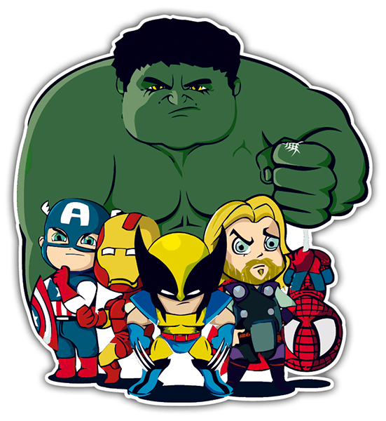 Sticker Cartoon Avengers. Adhesive of the components of this group of Heroes of the cinematographic universe of Marvel, with a children's cartoon style. Spiderman, Captain America, Hulk, Thor, Iron Man and wolf, you can have these magnificent superheroes to decorate your PC, skateboard, car ...