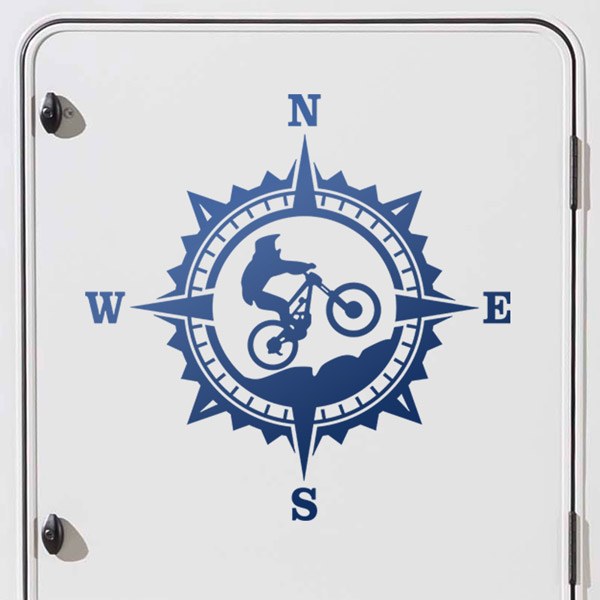 Sticker Wind Rose MTB. Original decorative sticker of the emblematic emblem of exploration, the wind rose, in which you can see this striking symbol with an interior that reflects an MTB bike in action. Made from high quality materials, this unique sticker is available in a range of colours and finishes.