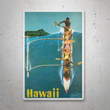 Sticker Canoe in the sea of Hawaii. Original illustration Surf Hawaii. This design shows Hawaiians surfing a wave in a kayak. The drawing is accompanied by the text Hawaii. These vintage designs are perfect to decorate bars, beach restaurants and surf shops.