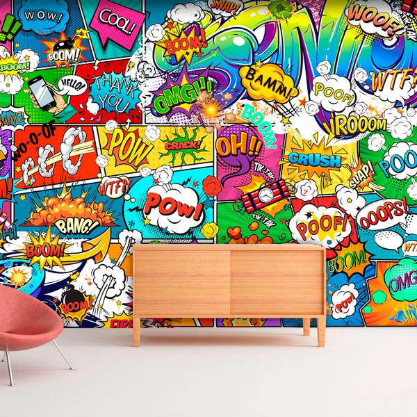 Wall Mural Onomatopoeias. Funny and crazy design of the typical onomatopoeias that appear in comics, which simulate sounds or noises. Each one has its own design, we can find among them "CRUSH" with a broken glass effect, "TIK-TAK" with an explosive or "POOF!" with several clouds of smoke.