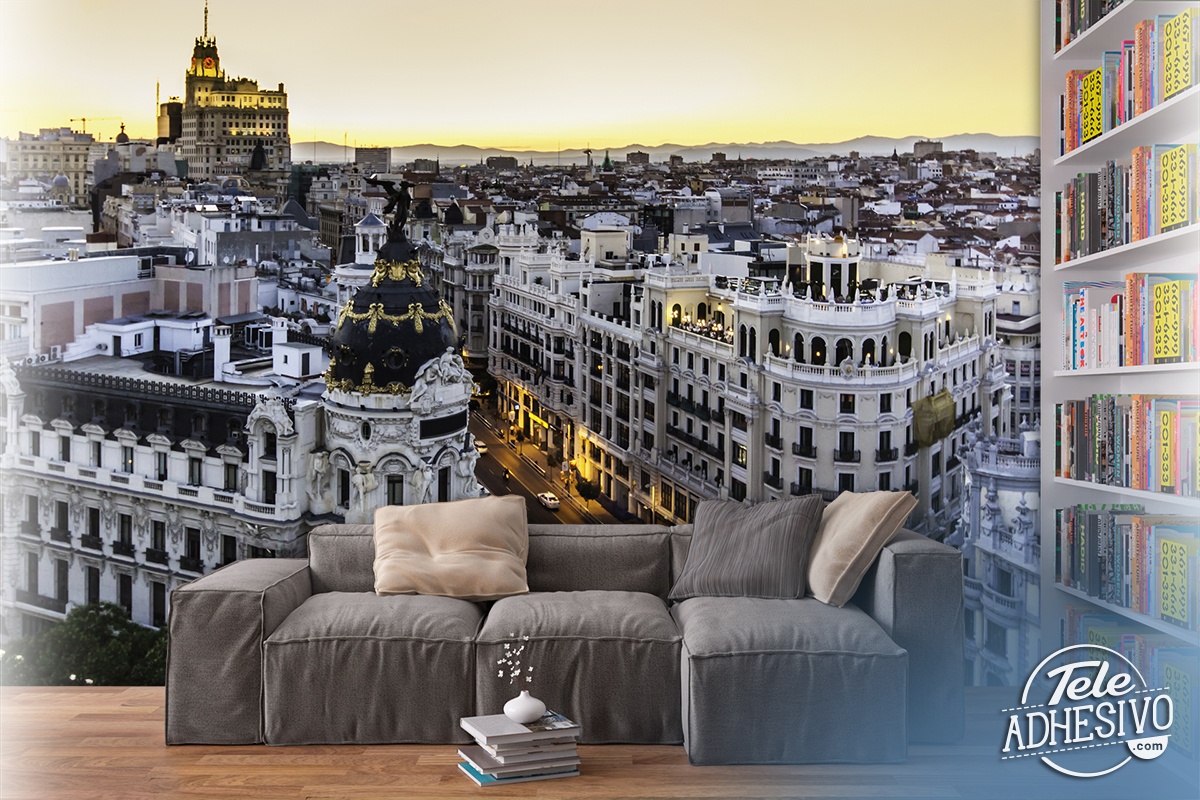 Wall mural The Great Way of Madrid. One of the main streets of Madrid, begins in the street of Alcalá and ends in the Plaza de España. Along its almost kilometre and a half in length we can find historical buildings such as the Metropolis, the telephone building, Capitol etc...