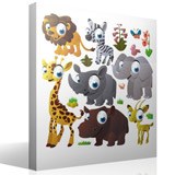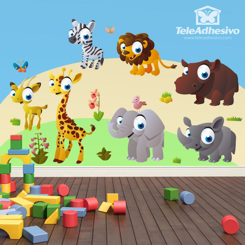 Kids wall sticker Kit Jungle animals. It consists of several emblematic animals of the African savanna. The lion, the giraffe, the zebra, the elephant, the rhinoceros, the hippopotamus and the gazelle, accompanied by two butterflies, caricatured in naive style and gathered in a single kit.
