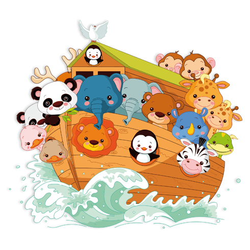 Kids wall sticker the ark of Noah sailing. Spectacular drawing of Noah's ark crossing the waves sharply before the eyes of many animals. In the ark goes a couple of each species, elephants, lions, penguins, monkeys, deer, giraffes, bears, ducks and many breeds of birds.