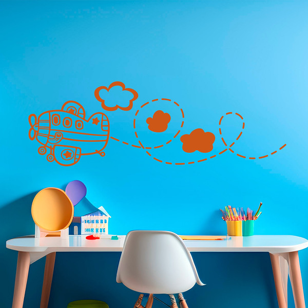 Nursery wall stickers Airplane between the clouds. Funny drawing of an airplane flying among the clouds. It has a star as an emblem and several windows on the side. A dashed line reveals the acrobatics that the airplane performs among the clouds in order to make your flight more fun.