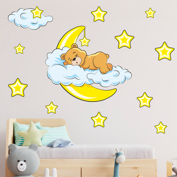Baby wall stickers teddy bear in the clouds and moon pink. For baby room decoration with yellow tones. The kit consists of 10 stars, a bear lying on a cloud above the moon, and a cloud with a star perfect for baby rooms. Different sizes available.