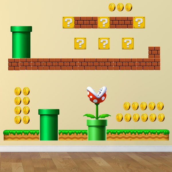 Kids Wall Sticker Set 45X Mario Bros Create your Screen. Funny designs to cut out with a pair of scissors and create your own composition. This set contains the perfect elements to make a screen of the Super Mario video game, including floor, brick blocks, surprise boxes, lots of coins, pipes and a piranha plant.