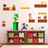 Kids Wall Sticker Set 60X Super Mario Bros. This set of the legendary video game will allow you to recreate your own Super Mario Bros. scene. It includes Mario, Luigi, Yoshi, Toad, enemies like Bob-Omb and Goomba, as well as brick blocks, a pipe, a star, a fire flower, several coins and mushrooms among others.