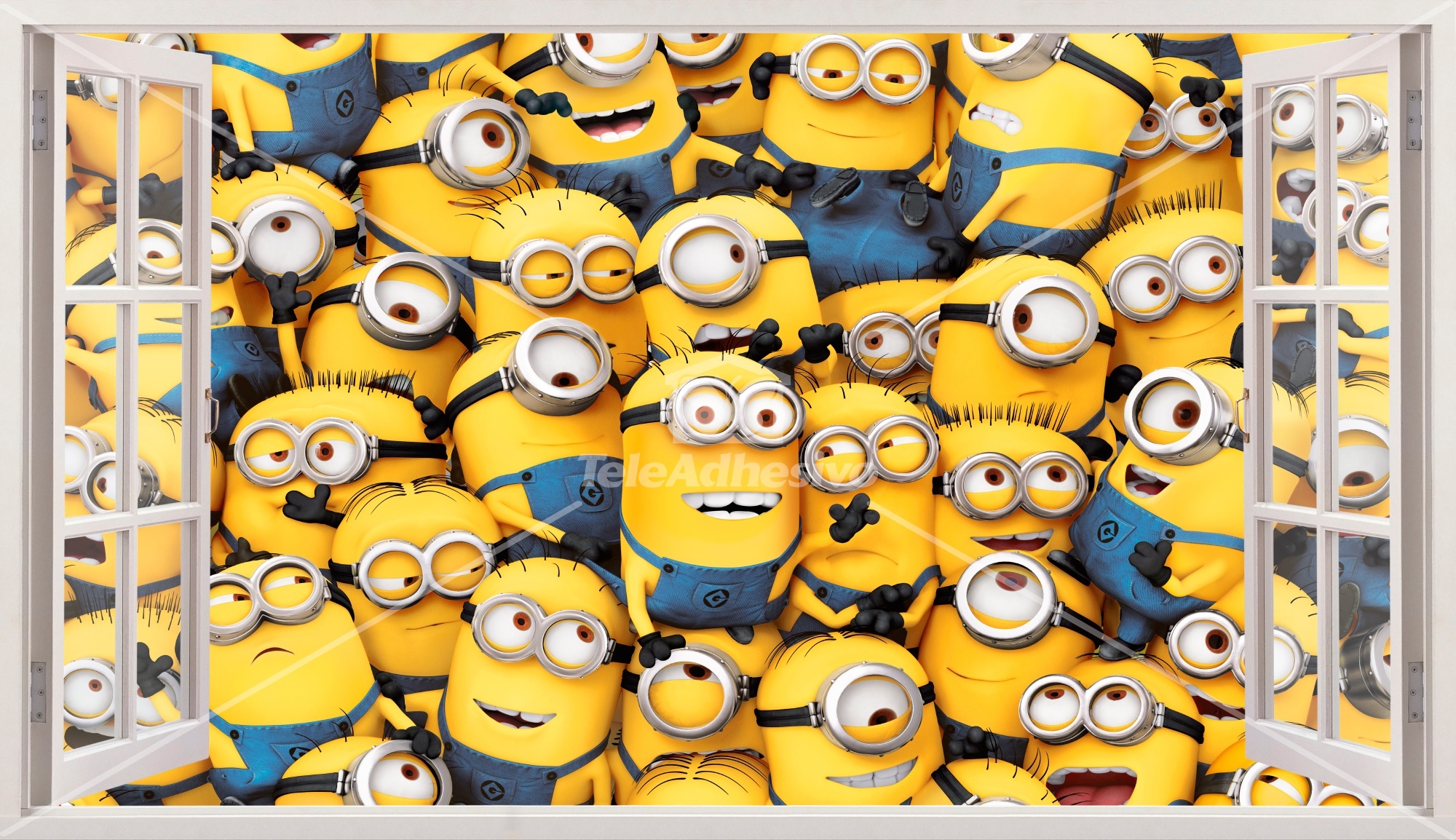 Vinyl 3D panoramic window Thousands of Minions. This trompe l'oeil will simulate an open panoramic window on your wall where a bunch of Minions will appear. These cute characters first appeared in the film My Favorite Villain, produced by Illumination Entertainment.
