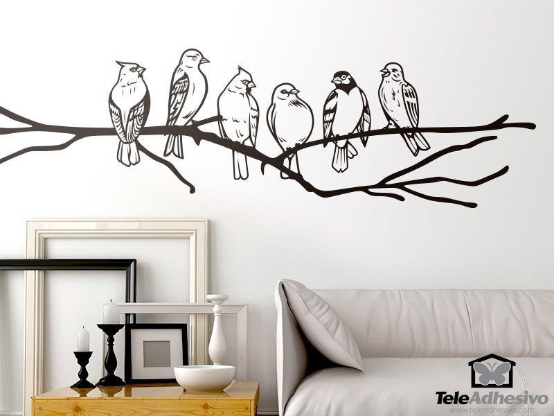 Wall sticker Birds on branch. Fantastic illustration with high detail of 6 species of birds on a branch of a tree. Canary, cockatoo, parakeet, greenfinch, cardelina, nymph ... are the most common bird races to have and to cheer with their songs home.