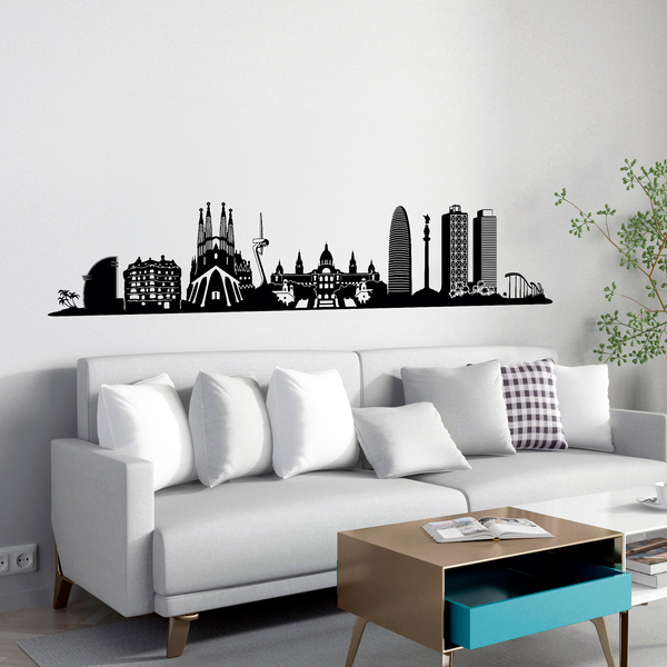Wall sticker of the skyline of Barcelona, with the most representative buildings and monuments. From left to right: Hotel Vela, Casa Milá(Pedrera), la Sagrada Familia, la Torre Calatrava, Palacio de Montjuic, Torre Agbar, Monumento Cristóbal Colón, Torre Hotel Arts, Torre Mapfre, Puente del Maremagnum.