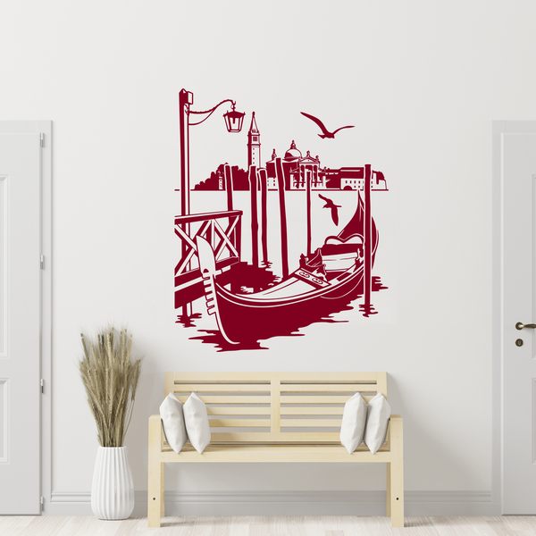 Wall sticker Gondola in Venice. Design of a Venetian gondola moored in the jetty waiting to go afloat with seagulls flying. In the background we can see the imposing Basilica of San Giorgio Maggiore, is a church of Catholic cult, located on the small island of San Giorgio Maggiore.