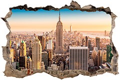 Wall sticker trompe l'oeil hole in the wall New York. Decorative vinyl sticker that represents to hole, inside the wall, in which you khan see the skyscrapers of New York City. Spectacular design that will make your home to unique and original space.
