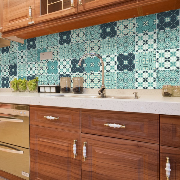 Kit 48 Decorative Wall Tiles green. This kit is made up of 48 vinyl tiles for bathrooms in cold colors, these are greenish tones combined with white, ideal for decorating the old tiles of your bathroom and give a fresher touch. Five different designs with geometric motifs that you can place to your own taste, giving a personalized result.